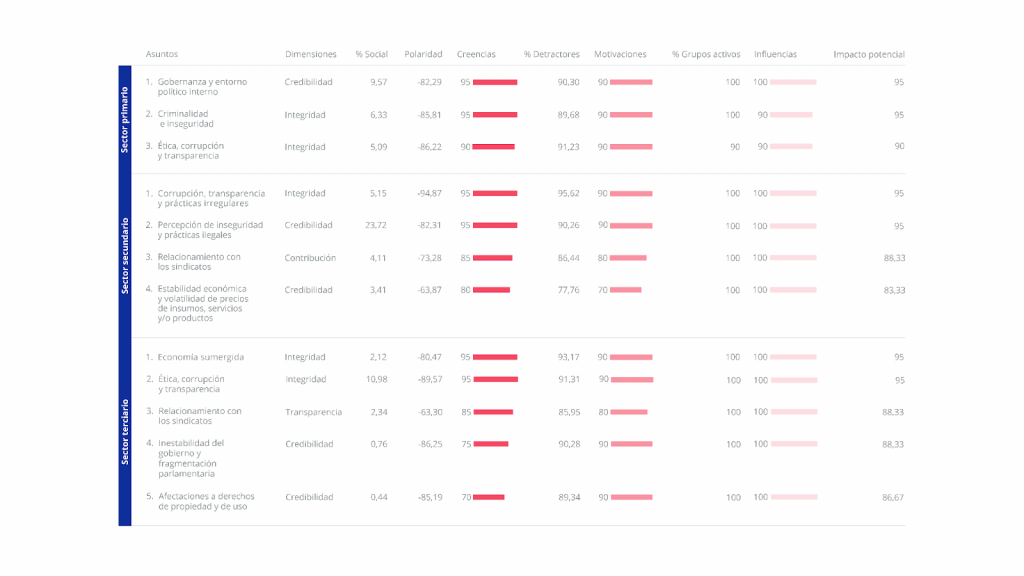 En este sector, los asuntos que generan mayor rechazo en la conversación digital están vinculados a “corrupción, transparencia y prácticas irregulares”, con un 95,6 % de detractores. Otros temas entre los que destaca un porcentaje elevado de detractores que incluyen “percepción de inseguridad y prácticas ilegales” (90,3 %) y “controversias públicas y polémicas” (86,8 %), evidenciando que casi todos los perfiles que contribuyen a la conversación social en estos temas lo hacen en tono crítico y negativo.