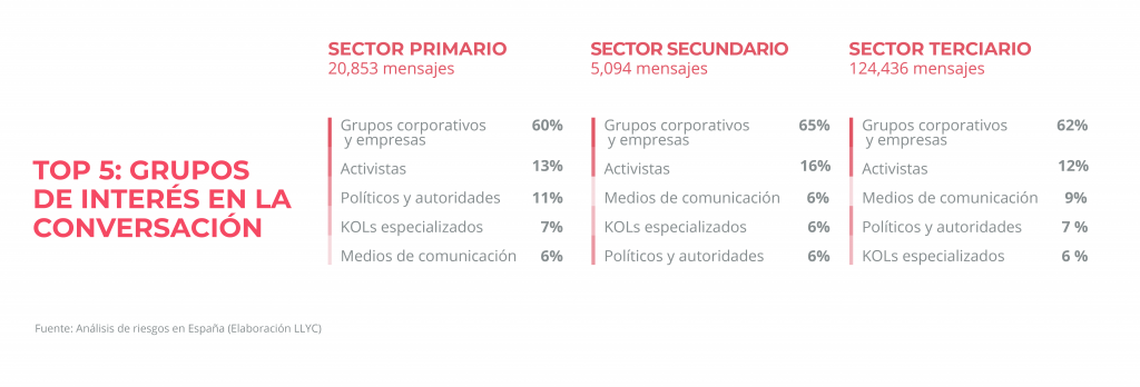 El análisis se centró en identificar menciones y percepciones, dentro de las conversaciones digitales, asociadas a los tres sectores principales de la economía española: primario, secundario y terciario. Cada uno de estos sectores agrupa actividades clave que impulsan el desarrollo económico y empresarial del país.