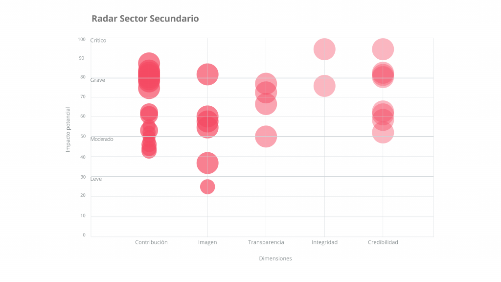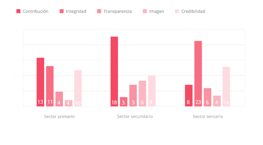 Los datos evidencian que la dimensión reputacional que concentra el mayor número de asuntos de riesgo para las empresas en España es la de Contribución, entendida como la percepción que tienen los grupos de interés sobre el impacto positivo de la empresa en la sociedad y su compromiso real con su propósito declarado. En promedio, el 28 % de los asuntos de riesgo identificados en los tres sectores están relacionados con expectativas sociales, más visibles en el sector primario y secundario. Por su parte, en el sector terciario predomina la dimensión de Integridad como la que concentra el mayor número de asuntos de riesgo. Esta dimensión se refiere a la percepción que tienen los grupos de interés sobre si las empresas actúan con honestidad, ejemplaridad y respeto a principios éticos y normativos.