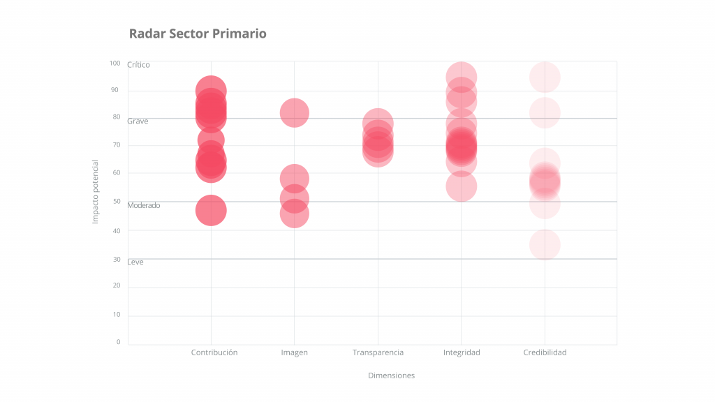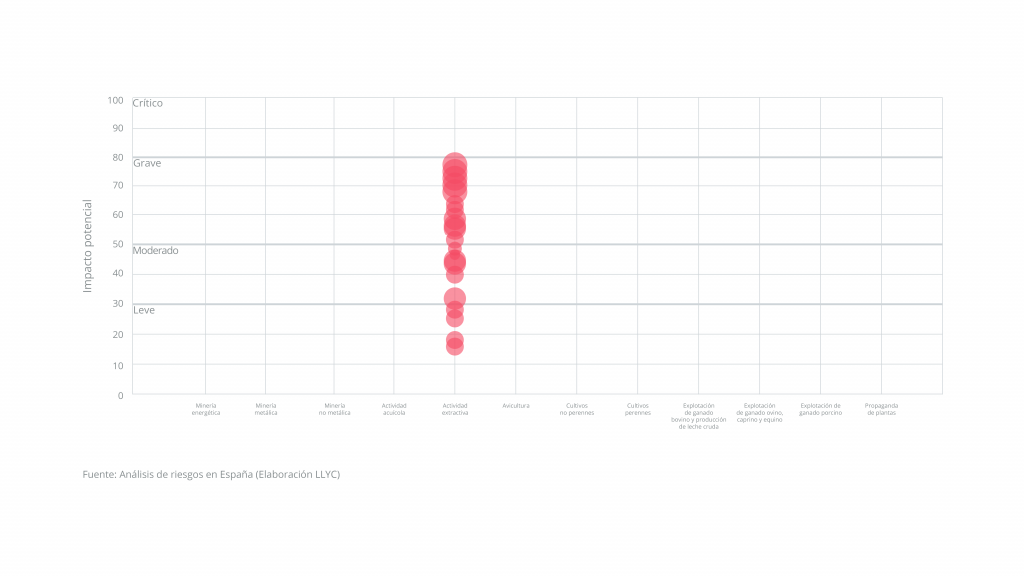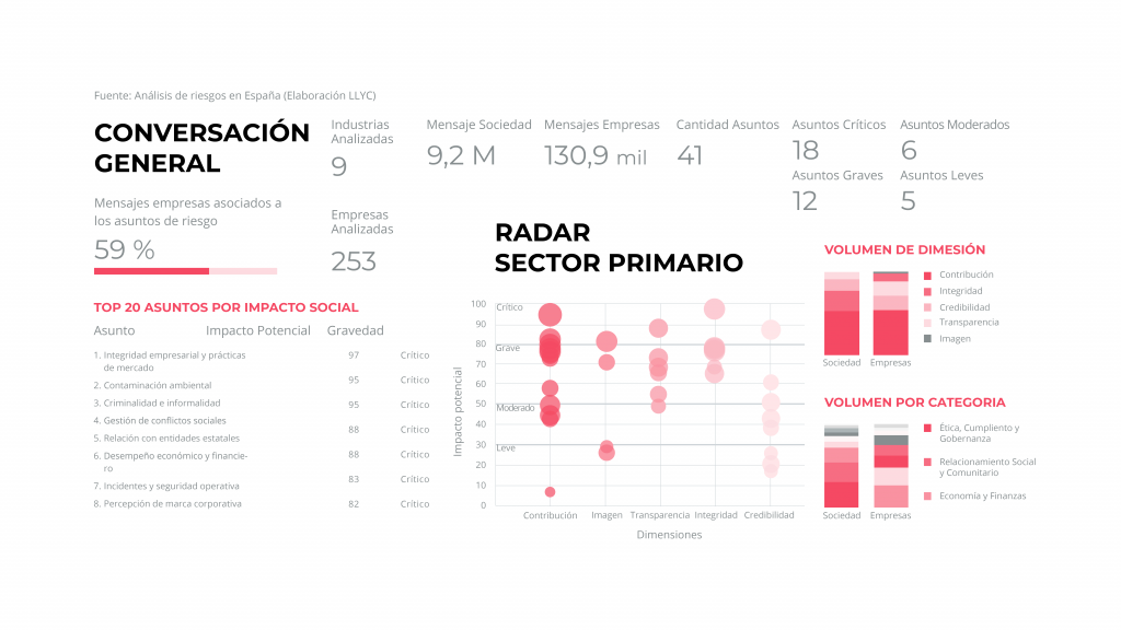 En este sector, se identificaron un total de 42 asuntos de riesgo, de los cuales el 90 % presentan alto impacto potencial: un 38 % como críticos y un 52 % como graves. En el sector primario, los asuntos críticos se concentran en la Minería metálica, la Actividad extractiva y la Explotación ganadera, con alto impacto potencial y abundantes menciones en la conversación digital.