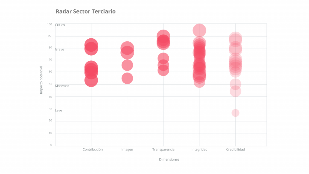 Por otro lado, la mayoría de los asuntos de riesgo en este sector presentan un impacto potencial medio-alto, con niveles de polaridad negativa especialmente marcados. Además de los ya mencionados, destacan entre los temas con mayor polaridad la “ética, corrupción y transparencia” (-89,6) y la “inestabilidad del gobierno y fragmentación parlamentaria” (-86,3). Estos resultados muestran que los riesgos más críticos en el sector terciario afectan principalmente a las cuestiones éticas de las organizaciones, más que a aspectos meramente operativos.