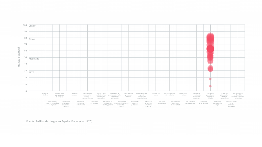 La Producción y distribución de energía eléctrica se posiciona como la industria del sector secundario con mayor exposición a riesgos críticos y graves. En total, se identifican 40 asuntos de riesgo, de los cuales un 10 % fueron clasificados como críticos, un 47,5 % como graves y un 38 % como moderados.