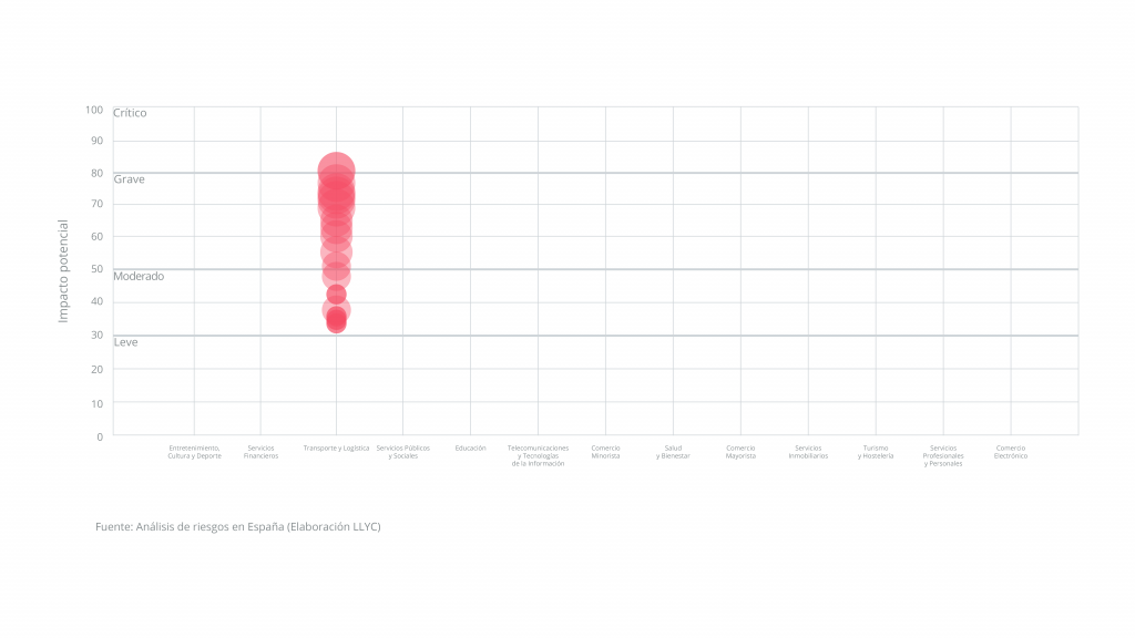 Aunque la mayoría de los asuntos de riesgo presentan un impacto potencial medio, algunos alcanzan niveles de polaridad negativa especialmente altos. Entre ellos se encuentran “corrupción, transparencia y prácticas irregulares” (-94,9), “cumplimiento normativo, regulaciones y sanciones” (-82,7) y “controversias públicas y polémicas” (-82,6).
