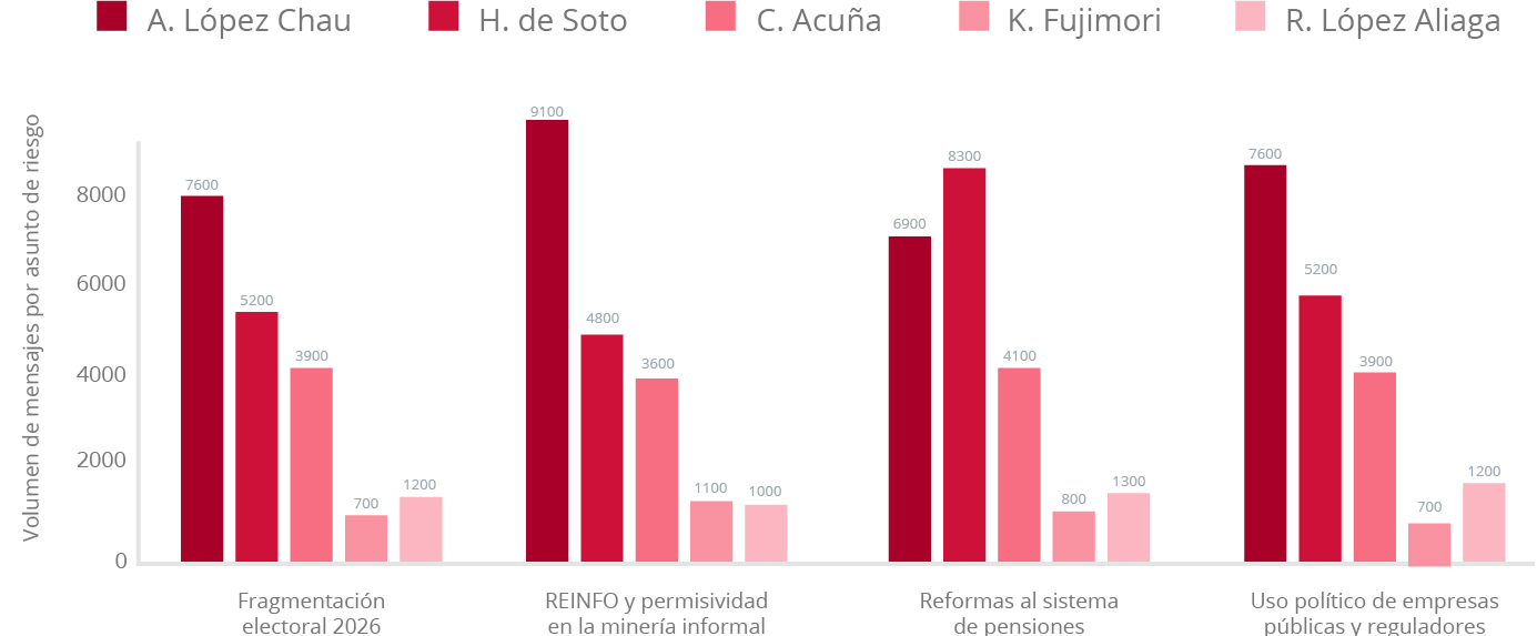 Lo relevante de esta activación es su concentración. Rafael López Aliaga y Keiko Fujimori, independientemente de su ubicación en las encuestas, concentran una parte significativa de la conversación, lo que indica que estos temas técnicos se están utilizando como herramientas de diferenciación en la disputa electoral.