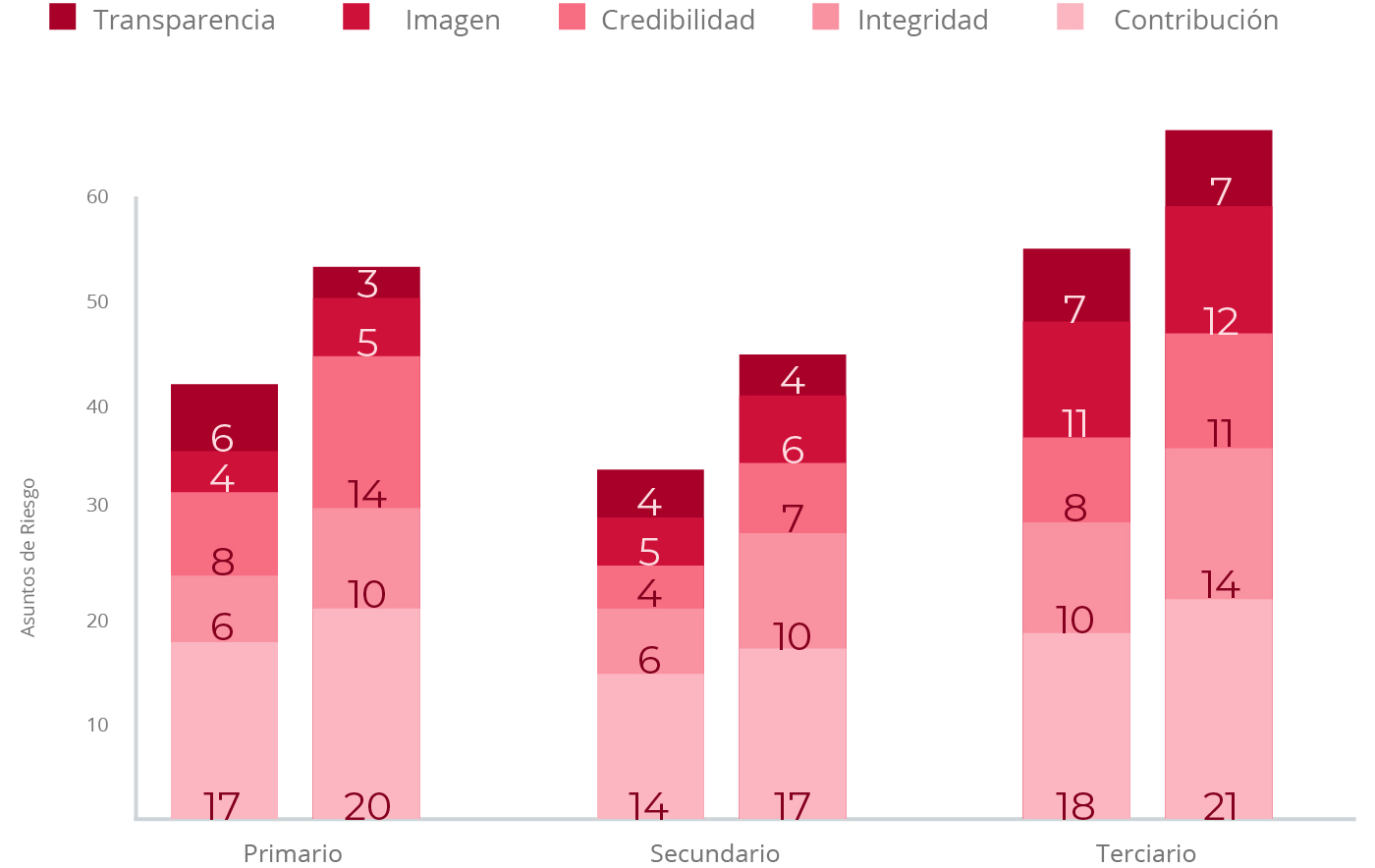 Uno de los hallazgos más significativos del periodo es la reconfiguración de las expectativas sociales. Si bien la dimensión de “Contribución” (el aporte de la empresa al entorno) mantiene su predominancia en volumen, la dimensión de Integridad ha registrado el incremento más notable, elevando su número de asuntos de riesgo en un 55%.