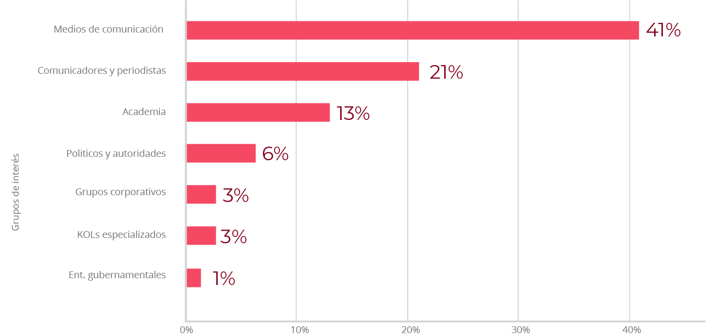 El análisis de actores evidencia un desequilibrio estructural en la conversación pública. Mientras el ecosistema mediático —medios, periodistas y comunicadores— ejerce una hegemonía discursiva al controlar más de la mitad del volumen total, la presencia de voceros corporativos es residual.