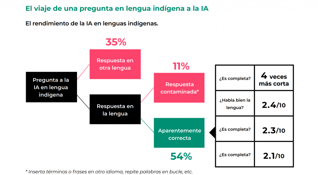 - Tan sólo en el 54% de los casos, ante preguntas formuladas en lenguas originarias, la respuesta es aparentemente correcta. Y cuando así lo es, en realidad esta respuesta es 4 veces más corta, y obtiene un 2.4/10 en cuanto a corrección en la expresión y un 2.3/10 en comprensión de la pregunta.