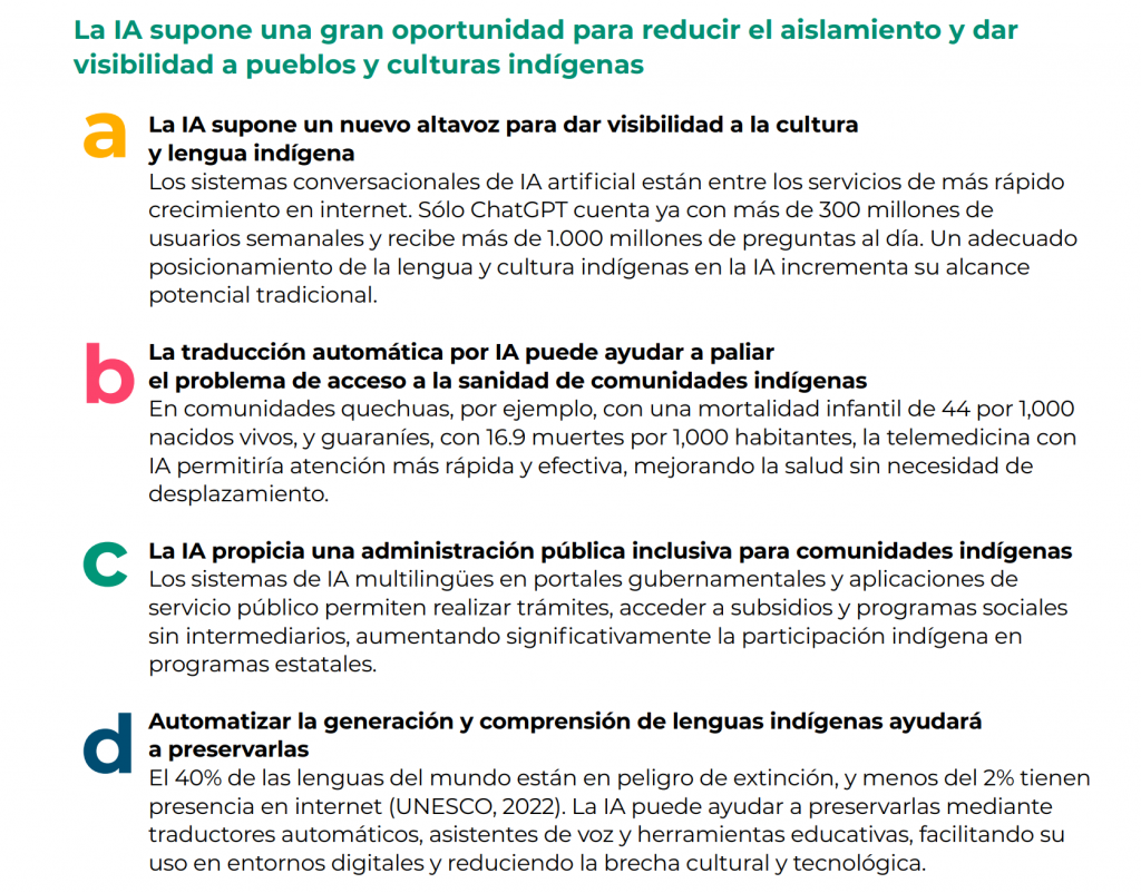 - Aprovechar los programas gubernamentales de apoyo indígena y las iniciativas de las Big Tech para que desarrollen tecnologías de IA conversacional en lenguas originarias.